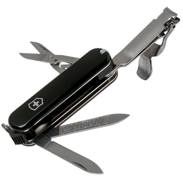 Victorinox NAILCLIP 580 0.6463.3 - швейцарський ніж із чорними глянцевими накладками та фірмовим логотипом Вікторінокс, поєднує в собі невелике гостре лезо та інструменти для догляду за нігтями. У його комплектації є ножиці з мікрозаточуванням, пилочка і кусачки для нігтів, а також інші корисні функції. Кніпсер забезпечує зручність і ефективність під час виконання процедур манікюру або педикюру, завдяки своїй компактності та легкості, а також фіксується спеціальним блокуванням типу Slider-Lock. Надійні та гострі леза з неіржавної сталі дають змогу точно обрізати нігті, а додаткові інструменти роблять догляд за нігтями ще зручнішим і комфортнішим.