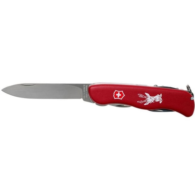 Victorinox HUNTER 0.8573 - це універсальний складаний ніж, створений для полювання та активного відпочинку на природі. Він має міцну і надійну конструкцію, здатну впоратися з різноманітними завданнями в будь-яких умовах. На червоних накладках ножа зображено оленя, що символізує його призначення і спеціалізацію. Основний клинок ножа має гладку заточку і здатний ефективно різати і обробляти різні матеріали, зокрема деревину і їжу. Механізм фіксації забезпечує зручність роботи, запобігаючи випадковому закриттю клинка під час використання. Крім основного леза, в цій моделі також є друге невелике лезо із зубчастим заточуванням і особливою формою, що полегшує оброблення дичини. А пилка стане в нагоді не тільки для дерева, а й для оброблення кісток. До набору входять: