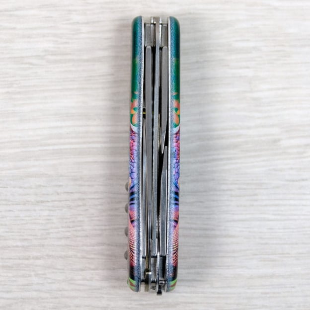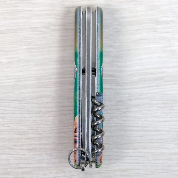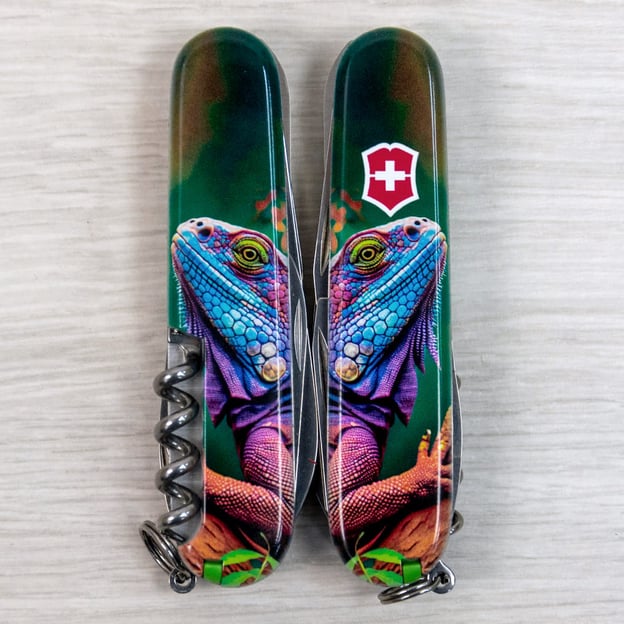 Victorinox CAMPER ANIMAL 1.3613.3.F1020pw - кишеньковий ніж «Хамелеон» із серії ANIMAL, створений спеціально для поціновувачів якісних швейцарських ножів. Рукоятки прикрашені яскравим зображенням хамелеона, виконаним за допомогою кольорового друку і покритим глянцевим лаком, який додає блиску і захищає від подряпин. Дизайн було розроблено як ексклюзивну пропозицію для українських шанувальників бренду. Модель CAMPER славиться своєю універсальністю, включаючи стандартний набір інструментів, таких як гостра пилка по дереву, два леза, відкривачки, шило та інші корисні функції. У серії ANIMAL набір доповнено сталевою шпилькою та аксесуарами в кольоровому виконанні - зубочистка та пінцет тепер ідеально гармоніюють з яскравим малюнком накладок.