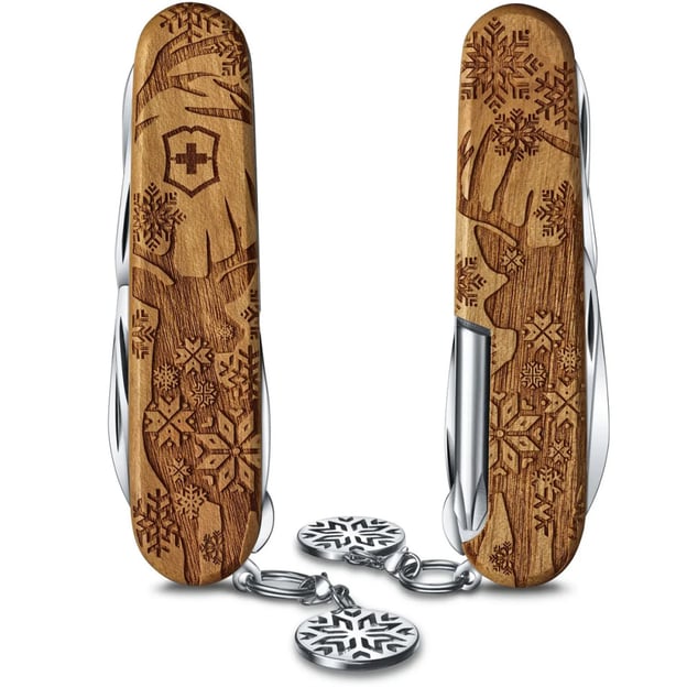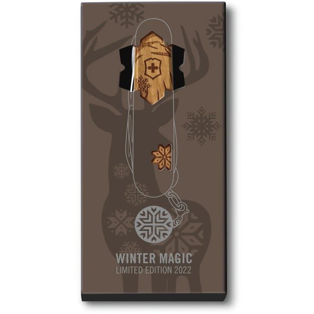 Victorinox SUPER TINKER Winter Magic SE 1.4701.63E1 - складаний швейцарський ніж із обмеженої колекції Winter Magic. Дизайн цього ножа натхненний зимовою атмосферою і святковим настроєм. Дерев'яні накладки з унікальним лазерним гравіюванням з натурального дерева мають привабливий зовнішній вигляд і прикрашені зимовими візерунками. Цей ніж буде корисний як у повсякденних завданнях, так і під час кемпінгу, подорожей або інших пригод на природі. Функціонал мультитула містить у собі різноманітні інструменти, які роблять його універсальним помічником у різних ситуаціях. Він оснащений такими інструментами: