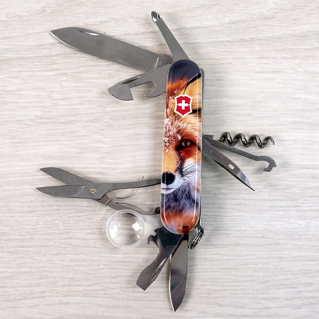 Victorinox EXPLORER ANIMAL 1.6703.7.F1060pw - багатофункціональний кишеньковий ніж з вишуканим дизайном, на якому зображено чарівну лисицю. Унікальний кольоровий друк вкриває обидві накладки, а глянцевий лак надає ножу виразного блиску та захищає малюнок від пошкоджень. Колекція ANIMAL виділяється яскравими особливостями: заміна стандартних пінцета і зубочистки на кольорові елементи, що ідеально гармонують із дизайном накладок. Також до комплекту входить шпилька, що робить цей ніж ще більш універсальним. Ніж поставляється в стильній упаковці з прозорим віконцем, щоб можна було одразу оцінити красу та унікальність дизайну. Вікторінокс 1.6703.7.F1060pw включає: