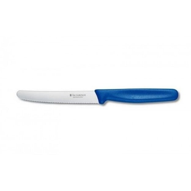 Victorinox STANDARD Tomato&Sausage 5.0832 - зручний і практичний кухонний ніж, створений для легкого й акуратного нарізки/чищення м'яких фруктів і овочів, завдяки серейторному лезу довжиною 11 см. Закруглений кінчик додає додаткову універсальність, даючи змогу не тільки різати, а й акуратно намазувати масло або джем на хліб. Клинок із професійним заводським заточуванням має електронне гравіювання, що підтверджує автентичність виробу та є повністю безпечним для металу. Синя ручка ножа виконана з поліпропілену, який стійкий до вологи, хімічних впливів і механічних пошкоджень. Ергономічна форма з нековзкою поверхнею забезпечує комфортний і надійний хват. Ця модель має високу стійкість до деформації та корозії, і стане чудовим інструментом для повсякденного використання на кухні.