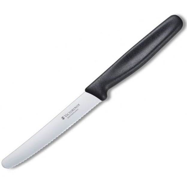 Victorinox STANDARD Tomato&Sausage 5.0833 - компактний кухонний ніж від легендарного швейцарського бренду Вікторінокс. Лезо завдовжки 11 см виконане із серейторним (хвилястим) заточуванням, яке робить його універсальним для роботи з м'якими овочами, фруктами, а також випічкою і ковбасами. Закруглений кінчик додає універсальності, даючи змогу не тільки нарізати продукти, а й акуратно намазувати джем, олію або мед, що робить ніж придатним для сервірування столу. Чорне руків'я в класичному дизайні забезпечує зручний і надійний хват, завдяки ергономічній формі та матеріалу з міцного поліпропілену. Матеріал стійкий до вологи, хімічних впливів і механічних пошкоджень, що робить ніж довговічним і зручним у щоденному використанні. Цей практичний інструмент для повсякденної роботи на кухні, стане надійним помічником у приготуванні ваших улюблених страв.