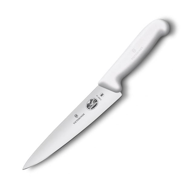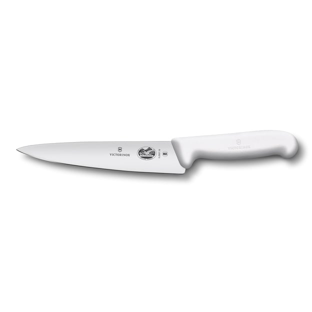 Victorinox FIBROX Carving 5.2007.19 - обробний ніж із білим руків'ям і 19-сантиметровим лезом, забезпечить максимальну точність нарізки та обробки м'яса, птиці, риби та інших продуктів. Ця модель із серії Fibrox поєднує гостре, пряме лезо з високовуглецевої сталі та ергономічне нековзке руків'я. Ніж розроблений для роботи з м'ясом, великими овочами та фруктами, а його універсальна заточка забезпечує чистий і точний зріз. Фірмова неіржавна сталь відрізняється стійкістю до корозії і довго зберігає заводську гостроту. На клинку нанесено електронне гравіювання з фірмовим логотипом, емблемою із зображенням орла, серійним номером і знаком якості NSF. Шорстке руків'я з термоеластопласту (TPE) гарантує зручний хват, знижує втому під час тривалої роботи та запобігає ковзанню, навіть у разі контакту з вологою або жиром. Матеріал стійкий до стирання, механічних пошкоджень і витримує температуру до 110°C, дозволяє стерилізувати ніж. Виробник надає довічну гарантію на виробничі дефекти, підтверджуючи преміальну якість свого інструменту.