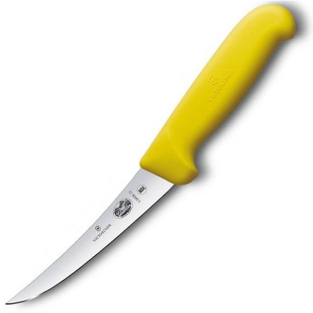 Victorinox FIBROX Boning 5.6608.12 - професійний обвалювальний ніж, розроблений для швидкої і точної роботи з м'ясом. Завдяки вигнутому вузькому лезу довжиною 12 см, він забезпечує легке відділення м'яса від кістки, мінімізуючи втрати продукту. Ця модель ідеально підходить для використання в м'ясопереробних цехах, на виробничих підприємствах і професійних кухнях. Лезо з міцної мартенситної неіржавної сталі, має оптимальний баланс гнучкості та твердості. Воно довго зберігає гостроту заточки, стійке до корозії і витримує інтенсивну експлуатацію. Гладка різальна крайка дає змогу робити чисті й акуратні зрізи, а рифлена бічна поверхня знижує опір під час роботи, полегшуючи процес обробки. На клинку нанесено лазерне гравіювання з логотипом Victorinox, серійним номером і сертифікатом NSF, що підтверджує відповідність міжнародним стандартам безпеки. Руків'я ножа виконано з міцного термопластичного еластомеру (TPE), який вирізняється високою зносостійкістю і стійкістю до механічних навантажень. Його шорстка поверхня забезпечує надійний хват, запобігаючи ковзанню навіть у вологих або жирних руках. Цей матеріал витримує температури від 80 до 110 °C, дозволяє легко дезінфікувати ніж і мити його в посудомийній машині.