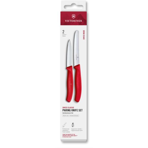 Victorinox SWISS CLASSIC 6.7111.2C1 - набір із двох кухонних ножів з червоними ручками. Цей ідеальний набір підходить для очищення і нарізки всіх видів овочів і фруктів. Ніж з гладким лезом зручний для акуратного нарізання томатів, очищення овочів і фруктів, а також підходить для нарізання м'яса або м'якого сиру. Ніж із серрейторним лезом відмінно справляється з продуктами з щільною шкіркою і м'якою м'якоттю, а також зручно ріже хлібобулочні вироби з хрусткою скоринкою. Леза з високоякісної неіржавної сталі відрізняються відмінною гостротою і стійкістю до корозії, а також не вимагають частого заточування. Компактний і надійний набір стане незамінним помічником на будь-якій кухні.