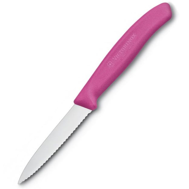 Victorinox SWISS CLASSIC Paring 6.7636.L115 - невеликий кухонний ніж із лезом завдовжки 8 см, створений для точного чищення та нарізки овочів і фруктів. Лезо з хвилястим (серейторним) заточуванням виготовлено зі штампованої неіржавної сталі, що забезпечує легкість та ефективність роботи навіть із м'якою або гладкою шскоринкою. Загострений кінчик ножа ідеально підходить для видалення насіння, вирізання дрібних деталей або виконання інших делікатних завдань. Яскраве рожеве руків'я зі зносостійкого поліпропілену має ергономічну форму і текстуровану поверхню, що гарантує зручний і безпечний хват. Цей ніж не тільки практичний у використанні, а й додає стильного акценту вашому кухонному начиння.