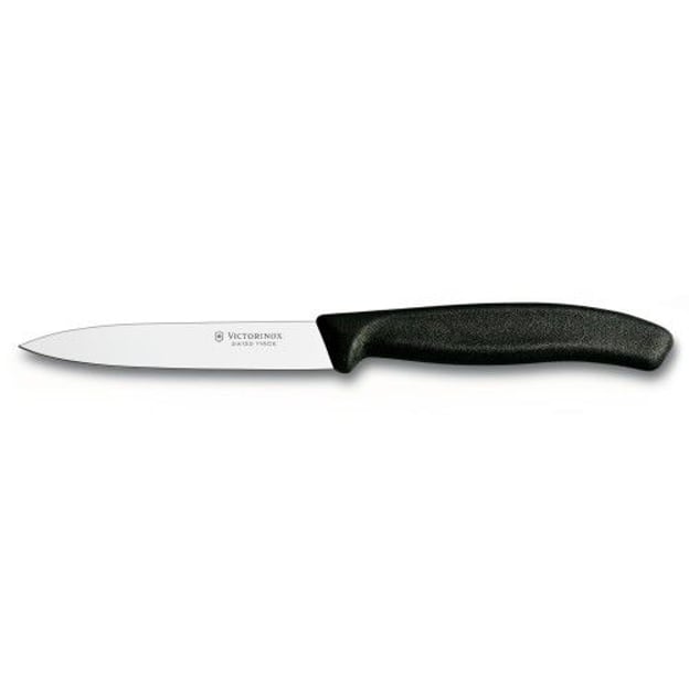 Victorinox SWISS CLASSIC Paring 6.7703 - універсальний кухонний ніж із класичною чорною ручкою, ідеально підходить для щоденної роботи на кухні. Лезо завдовжки 10 см із гладкою різальною крайкою і загостреним кінчиком, розроблене для точного й акуратного чищення, нарізки та декорування овочів, фруктів та інших продуктів. Клинок виготовлено з міцної неіржавної сталі, яка стійка до корозії та зберігає заводську гостроту протягом тривалого часу. Завдяки ідеальному балансу між вагою і маневреністю, ніж зручно використовувати для роботи як з великими, так і з дрібними продуктами. Руків'я виконане зі зносостійкого термопластика (поліпропілену) з протиковзкою текстурою. Його ергономічна форма забезпечує надійний і комфортний хват, навіть якщо ваші руки мокрі. Модель відноситься до популярної серії Swiss Classic, відомої широким асортиментом кольорів, варіантів лез і довжини.