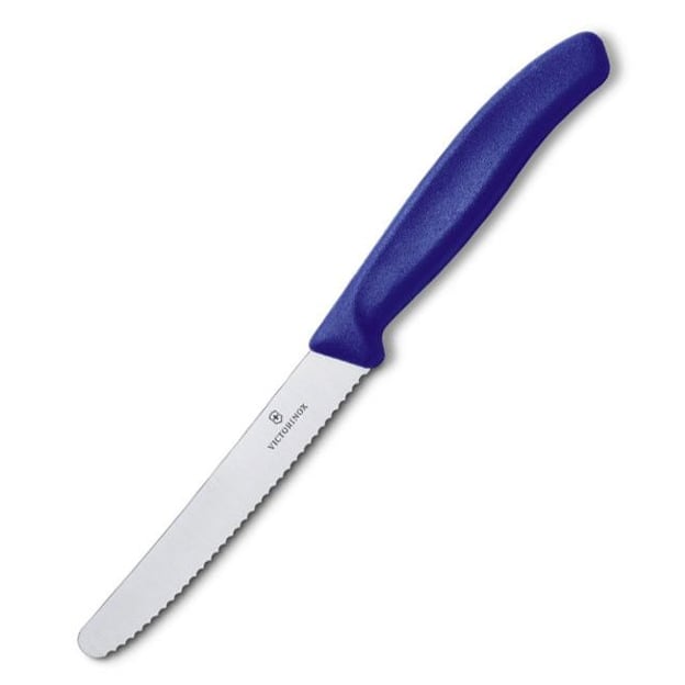 Клинок виконаний зі штампованої неіржавної сталі з електронним гравіюванням, що підтверджує автентичність виробу та є повністю безпечним для металу. Оптимальний склад сплаву дає змогу лезу довго зберігати свою гостроту, а також має високу стійкість до деформації та корозії. Руків'я із синього термопластика з текстурованою поверхнею забезпечує надійний хват, запобігаючи вислизанню ножа. Ніж Вікторінокс стане справжнім помічником на вашій кухні і чудово підійде в якості столового приладу при сервіруванні столу.
