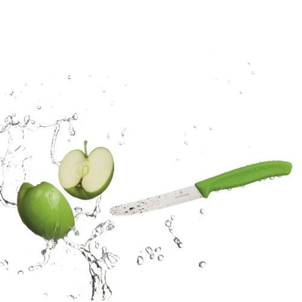 Victorinox SWISS CLASSIC Tomato&Sausage 6.7836.L114 - кухонний ніж із лезом завдовжки 11 см, виготовлений зі штампованої неіржавної сталі високої якості. Серейторна (хвиляста) заточка і закруглений кінчик роблять його ідеальним інструментом для нарізки овочів і фруктів з м'якою шскоринкою, ковбас, випічки, а також для зручного намазування масла, джему або паштетів. Ніж із колекції Victorinox SWISS CLASSIC стане надійним помічником у приготуванні страв і сервіруванні столу, втілюючи в собі швейцарську якість і довговічність.