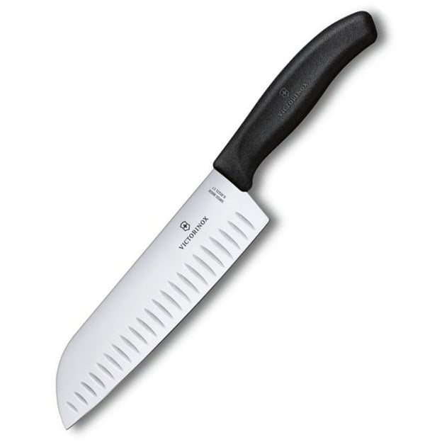 Victorinox SWISS CLASSIC Santoku 6.8523.17B - кухонний ніж-сантоку з чорною ручкою і рифленим 17-сантиметровим лезом. Назву «ніж трьох чеснот» він отримав завдяки своїй здатності бездоганно розрізати, нарізати і подрібнювати м'ясо, рибу, овочі, фрукти і зелень. Особливість моделі - рифлене лезо, що запобігає прилипанню нарізаних шматочків до поверхні ножа. Клинок виготовлено із високоякісної неіржавної сталі, який забезпечує довговічність, стійкість до корозії та чудову гостроту. Ергономічне нековзке руків'я з термостійкого полімеру зручно лягає в руку, не вбирає вологу і запахи, стійке до температурних перепадів і механічних навантажень. Цей ніж поєднує в собі практичність, надійність і стильний дизайн, роблячи процес приготування їжі легким і приємним.
