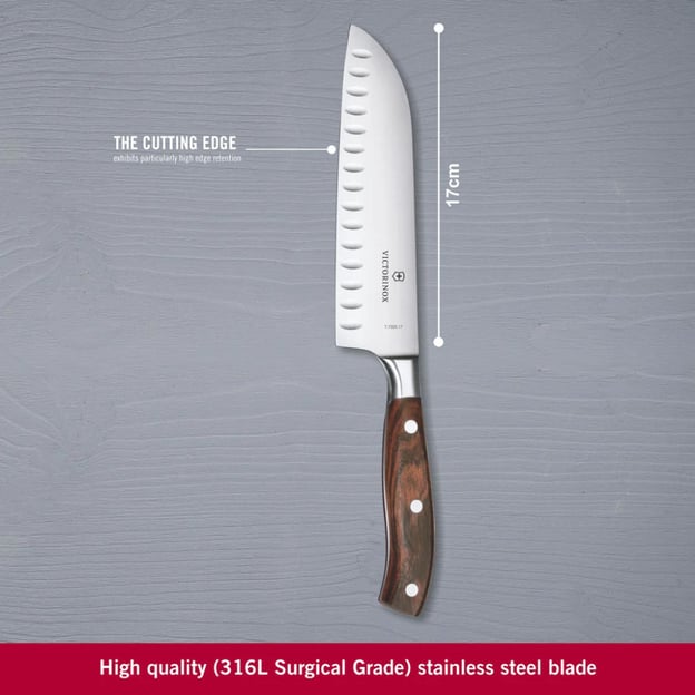Victorinox GRAND MAITRE Wood Santoku 7.7320.17 - універсальний ніж у японському стилі, ідеально підходить для виконання різних завдань на кухні. Лезо завдовжки 17 см виготовлено з високоякісної кованої неіржавної сталі, що забезпечує довговічність і стійкість до корозії. Завдяки широкій формі та оптимальній вазі, ніж легко впорається з нарізкою, шинкуванням і рубанням м'яса, риби, овочів і зелені. Гладка (Plain) заточка гарантує чистий і акуратний зріз, а рифлене лезо запобігає прилипанню продуктів під час роботи. Руків'я виготовлено із модифікованого клена з заклепками, що надає ножу елегантного зовнішнього вигляду і забезпечує комфортний, надійний хват. Дерев'яне руків'я ретельно відполіроване для ідеальної гладкості та стійкості до вологи, проте рекомендується уникати миття в посудомийній машині для збереження його первісного вигляду. Фірмове гравіювання з логотипом Victorinox на лезі підкреслює оригінальність і преміальну якість виробу. Ніж Вікторінокс Vx77320.17G поєднує в собі традиції японської майстерності та швейцарську якість, що робить його ідеальним вибором як для професійних кухарів, так і для поціновувачів кулінарії в домашніх умовах.