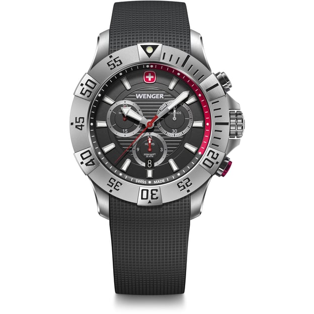 - Чорний текстурований циферблат із червоною деталізацією та логотипом Wenger.