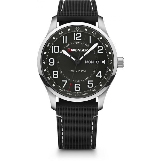 Годинник оснащений точним кварцовим механізмом, індикацією дня тижня та дати, а також люмінесцентними стрілками для читання часу в умовах низького освітлення. Чорний циферблат з великими арабськими цифрами та детальною хвилинною шкалою забезпечує високу читаність часу. Водозахист до 10 АТМ дозволяє не знімати годинник під час водних активностей, але не підходить для дайвінгу. Завдяки задній кришці з конструкцією, що загвинчується, годинник має додаткову герметичність. Якість швейцарського бренду Wenger підтверджено знаком Swiss Made, що гарантує дотримання високих стандартів.