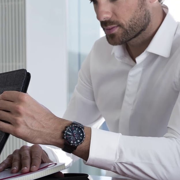 - Великий корпус 44 мм із неіржавної сталі з PVD-покриттям чорного кольору.