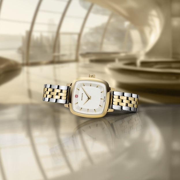 Квадратна форма корпусу повторює елемент фірмового дизайну марки Wenger та підкреслює вінтажну естетику і унікальність. Білий матовий циферблат з оздобленням «сонячні промені» виглядає елегантно і легко читається. Стрілки зі світлонакопичувальними вставками SuperLumiNova забезпечують оптимальну читаність навіть в умовах низького освітлення. Вишуканий сталевий браслет із рухомою конструкцією застібки дозволяє швидко відрегулювати обхват браслета під вашу руку. Елегантна кварцова модель у мінімалістичному оформленні, яка чудово підходить під діловий та вечірній стиль.