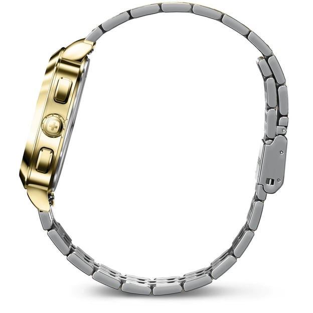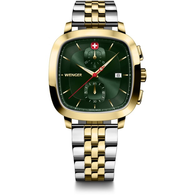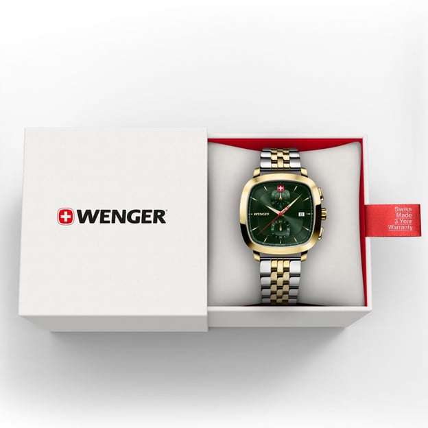 Квадратна форма корпусу повторює форму логотипу Wenger, а сатинований циферблат із декоративним ефектом «сонячні промені» додає витонченості та глибини. Хронограф забезпечує функцію аналогового секундоміра, а світлонакопичувальні елементи на стрілках гарантують комфортне зчитування часу навіть у темряві. Додаткова індикація дати робить годинник максимально практичним. Вишуканий сталевий браслет із зручною рухомою застібкою забезпечує легке та швидке регулювання його довжини під індивідуальний обхват. Окремої уваги заслуговує фірмова заводна головка зі швейцарським хрестом, яка традиційно розташована на правому боці корпусу, додаючи моделі автентичності та впізнаваності.