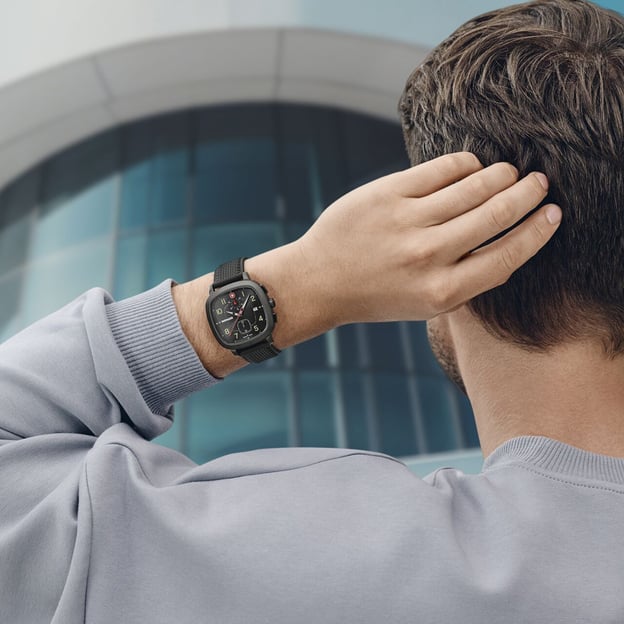 - Квадратний корпус 40 мм із неіржавної сталі із PVD-покриттям Black Ice.