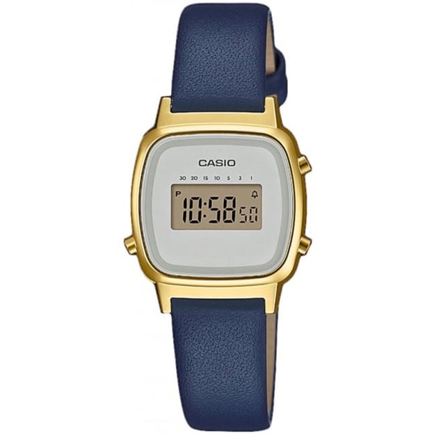 Casio STANDARD Digital LA670WEFL-2EF — жіночий цифровий годинник у стриманому класичному стилі. Квадратний полімерний корпус у золотистому кольорі виглядає легким і акуратним на зап’ясті, а синій шкіряний ремінець додає м’якості та контрасту. Акрилове скло підходить для щоденного носіння, а компактний корпус 24 мм з товщиною 7 мм не перевантажує образ.