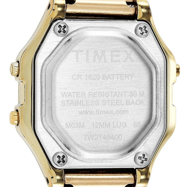 Timex Classic Digital TW2T48400 — жіночий цифровий годинник у ретро-стилі від легендарного американського бренду Timex. Модель виконана в міцному та надійному корпусі зі зносостійким покриттям у золотистому відтінку. Зменшений квадратний корпус розміром 27 мм, цифровий дисплей та ударостійке акрилове скло створюють стильний і практичний образ. Водозахист 3 ATM (30 метрів) забезпечує базовий захист від вологи в повсякденній експлуатації, годинник стійкий до випадкових бризок, крапель води та дощу, тому його можна спокійно носити у звичайних побутових умовах.