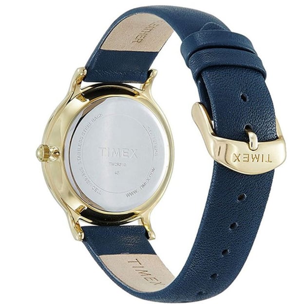 Timex Transcend TW2R51000 — жіночий годинник у класичному стилі з круглим латунним корпусом у золотистому відтінку. Синій циферблат виглядає стримано й виразно, а аналогова індикація робить зчитування часу простим і звичним.