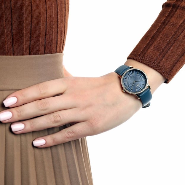Шкіряний ремінець синього кольору підкреслює загальний тон моделі та комфортно сидить на зап’ясті. Мінеральне скло захищає циферблат від повсякденних дрібних подряпин, кварцовий механізм забезпечує точний хід, а водозахист 3 ATM підходить для звичайного щоденного носіння без занурення у воду.