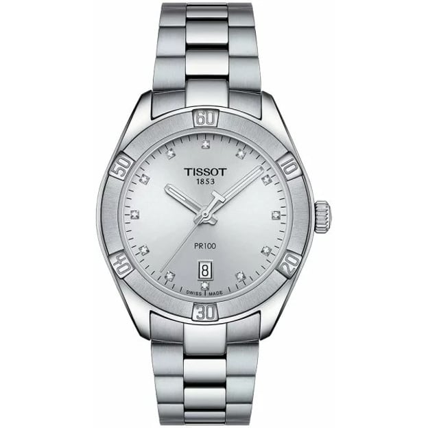 Жіночий кварцовий годинник Tissot PR100 Sport Chic з діамантами. Неперевершена швейцарська класика з нотками спортивного шику. Лаконічна естетика символізує розкіш, якість та класичний стиль. Спортивних рис надає безель зі стилізацією під дайверський. Діаманти на сріблястому циферблаті перетворюють годинник Tissot на вишукану прикрасу, яка стане чудовим доповненням до вашого образу успішної та елегантної жінки. Ця модель Tissot оснащена функцією EOL, яка заздалегідь повідомить вас про необхідність заміни батарейки. Має високий клас водонепроникності до 10 атм та гарне скло із сапфіру. Ця жіноча модель серії PR 100 має середній розмір корпусу і залежно від ваших індивідуальних вподобань буде красиво виглядати на зап'ястку будь-якого розміру.
