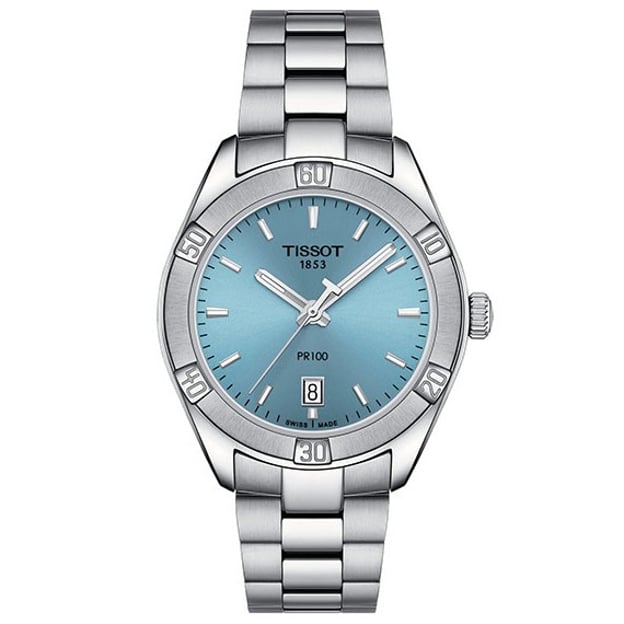 Швейцарський кварцовий годинник для жінок Tissot PR 100 Sport Chic 36 мм з блакитним циферблатом та сталевим браслетом. Лаконічна естетика символізує розкіш, якість та класичний стиль. Спортивних рис надає безель зі стилізацією під дайверський. Прекрасне доповнення до вашого образу успішної та елегантної жінки. Ця модель Tissot оснащена функцією EOL, яка заздалегідь повідомить вас про необхідність заміни батарейки. Має високий клас водонепроникності до 10 атм та гарне скло із сапфіру. Жіноча модель серії PR 100 має середній розмір корпусу і залежно від ваших індивідуальних вподобань буде гарно виглядати на зап'ястку будь-якого розміру.