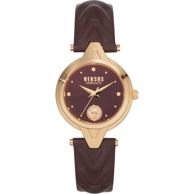 Чорний гільширований циферблат прикрашений індексами та скульптурним логотипом бренду Versus Versace Lion відтінки рожевого золота.