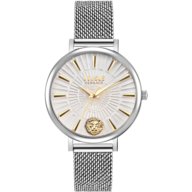 Рельєфний білий циферблат годинника Versus Mar Vista Vsp1f0321 прикрашений золотавими індексами та логотипом у формі левової голови.