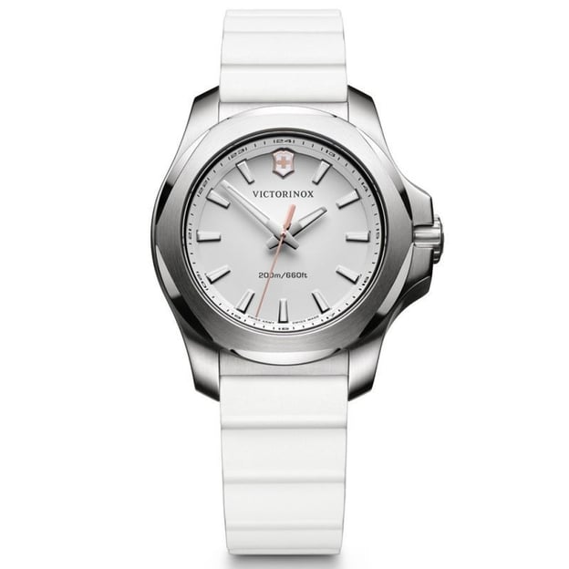 Victorinox V241769 - жіночий швейцарський годинник I.N.O.X. V з екстремально міцним сталевим корпусом і білим каучуковим ремінцем. Бездоганне поєднання зухвалого сталевого силуету з грубим різьбленим безелем, гумового ремінця для ваших спортивних захоплень навіть водними видами спорту та маленьких акцентів, що надають жіночності дизайну.
