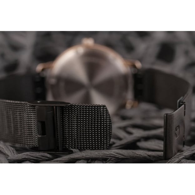 Швейцарський аналоговий годинник із кварцовим механізмом, надійною водонепроникністю 100 метрів та мінімалістичним циферблатом. Як тонкий натяк на паузу замість індексів на позначці «3 години» виблискують кристали Swarovski. Ніжний рельєфний візерунок на чорному тлі додає витонченості циферблату. Полегшений сталевий браслет-сітка прекрасний своєю візуальною досконалістю і неймовірно зручний у носінні. Завдяки задній кришці, що загвинчується, годинник має додаткову герметичність корпусу.