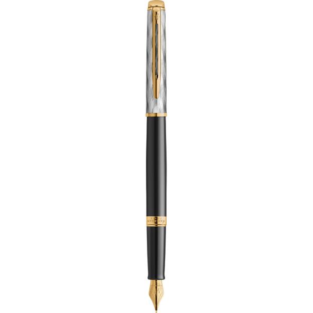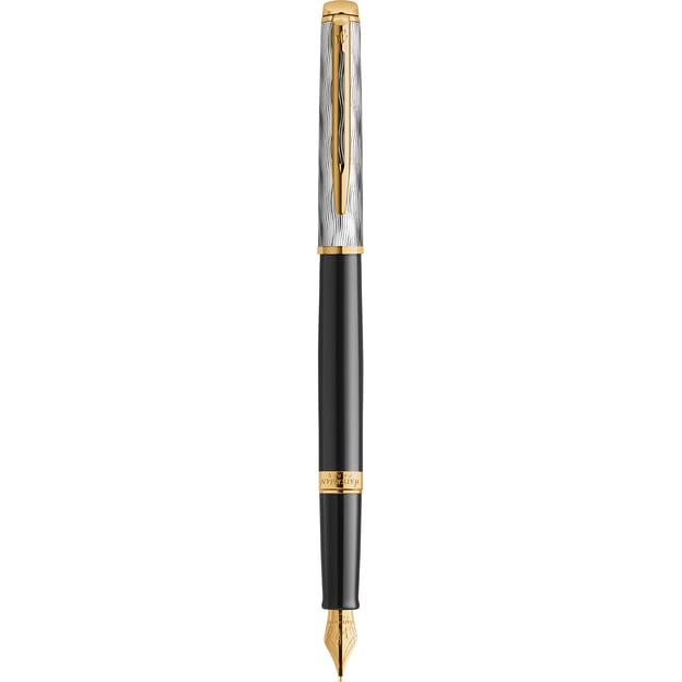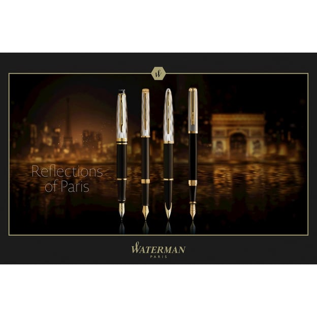 Waterman HEMISPHERE Reflections Of Paris FP M – элегантная перьевая ручка с позолоченным пером среднего размера. Модель, сочетающая черный глянцевый лакированный корпус с позолоченными деталями и изящным колпачком с палладиевым покрытием. Ее дизайн – настоящая ода Парижу: он отражает романтическое настроение ночного города, освещенного золотым сиянием кафе и фонарей, а волнистый гравированный узор на колпачке символизирует плавное течение Сены. Скошенный торец колпачка, характерный для коллекции Hemisphere, напоминает оцинкованные крыши Парижа, придавая изделию особого шарма.