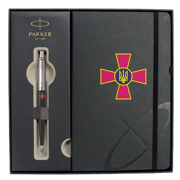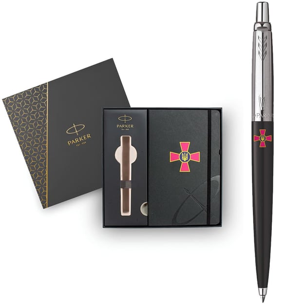 Подарочный набор Parker 15632b24_W0010u из эксклюзивной коллекции JOTTER ARMY. В комплектации шариковая ручка JOTTER Originals Black CT и блокнот, дополненные эмблемой Вооруженных сил Украины. Благодаря уникальному дизайну станет практичным и стильным презентом всем защитникам Украины. Простая, компактная и функциональная ручка для работы и частого письма.