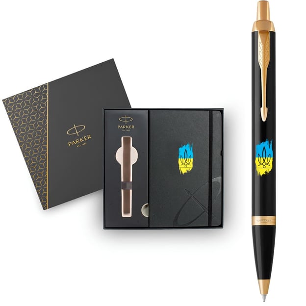 Набор: ручка шариковая Parker IM UKRAINE Black GT BP Трезубец фигурный на фоне флага + блокнот Parker + подарочная коробка