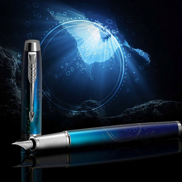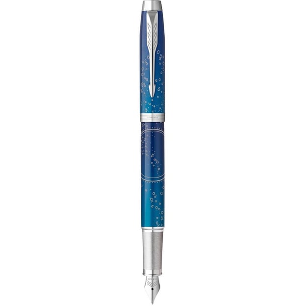 Parker IM Last Frontier Submerge CT FP F (Special Edition) – перьевая ручка специального выпуска 2021 года, посвященного исследованием загадочных уголков Вселенной. Премиальный дизайн в отделке Submerge рассказывает о неизведанных глубинах мирового океана при помощи двухцветного лака и рисунка из пузырьков воды и иллюминаторов.