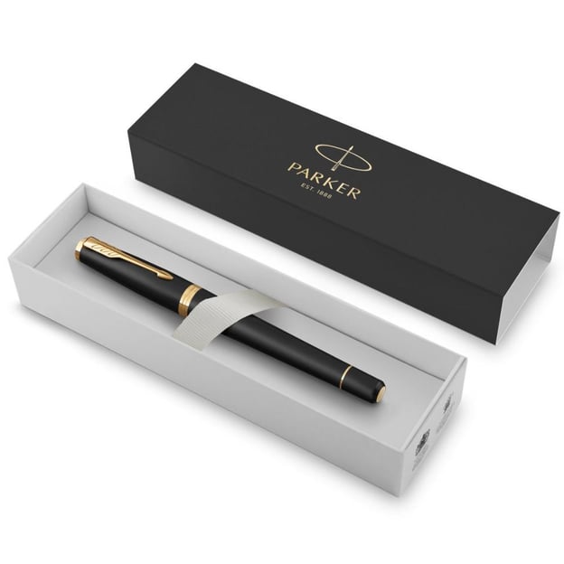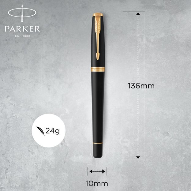 Parker URBAN Muted Black GT FP F — элегантная перьевая ручка с матовым черным корпусом, украшенная золотыми деталями. Эта модель входит в популярную серию Urban, которая известна своей пулеобразной формой. Она идеально подходит для качественного и аккуратного письма благодаря прочному латунному корпусу и съемному колпачку. Ручка имеет элегантное покрытие черным матовым лаком, которое придает ей утонченный вид, в то время как золотые акценты подчеркивают премиальность изделия. Тонкое перо из нержавеющей стали, обеспечивает плавность и комфорт при письме, а также украшено фирменной гравировкой. Ручка совместима как со сменными картриджами, так и с конвертером, позволяющим использовать чернила из баночки.