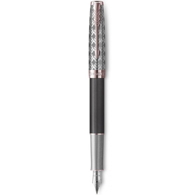 Ручка-перо Parker SONNET Metal & Grey Lacquer PGT FP18 F - это роскошный аксессуар для тех, кто ценит стиль и утонченность. Она оснащена пером размера F и выполнена из нержавеющей стали с графитовым покрытием глянцевым лаком. Колпачок, также из стали, украшен уникальным узором, созданным с помощью химического травления, что придает ручке оригинальность. Ручка имеет элегантную отделку из розового золота, а перо изготовлено из твердого 18-каратного золота с родиевым покрытием. Эта модель идеально подходит для важных мероприятий, подписания документов, создания заметок или для ежедневного использования. Отличная конструкция и материалы перьевой ручки обеспечивают легкость и удобство письма, делая ее фаворитом среди пишущих инструментов.