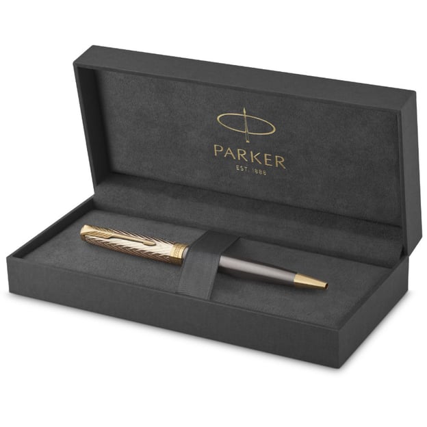 Parker SONNET SE Pioneers GT BP – эксклюзивная модель шариковой ручки от Паркер, выполнена в утонченном сочетании серого и золотого цветов. Поворотный колпачок с 23-каратным золотым покрытием украшен изысканным химически вытравленным узором, изображающим стрелу, направленную вверх. Этот символ олицетворяет дальновидность Джорджа Паркера и его инновационный подход к созданию по-настоящему уникальных инструментов. Зажим в виде стрелы и грипп-секция также имеют позолоченную отделку. Механизм плавной активации и комфортная форма обеспечивают удобство письма, превращая ручку Parker SONNET в настоящий шедевр для коллекционеров и ценителей качества.