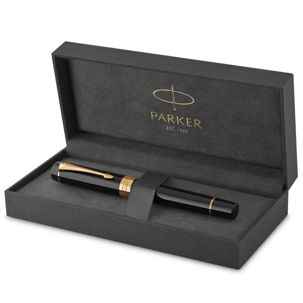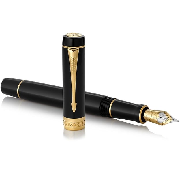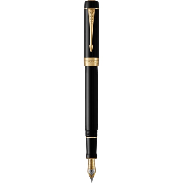 Элегантная перьевая ручка Parker DUOFOLD Classic Black GT FP18 F с золотым пером – истинное произведение искусства, собранное вручную для обеспечения безупречного качества. Этот легендарный письменный инструмент создан для тех, кто ценит не только результат, но и эстетическое удовольствие от процесса письма. Корпус и съемный колпачок изготовлены из изысканной черной смолы, которая своим глубоким блеском напоминает эмаль. Завершают изысканный образ детали из 23-каратного золота, придающие модели статусный и дорогой вид. Каждый элемент ручки продуман до мелочей: от фирменного клипа-стрелы до гравировки на торце колпачка. Особое внимание привлекает двухцветное перо из 18-каратного золота с родиевым покрытием, которое обеспечивает прочность, точность и легкость письма. Перо украшено гравировкой с ювелирным клеймом и отметкой 18K-750. Ручка совместима с картриджами Parker и конвертером для чернил из флакона (приобретаются отдельно).