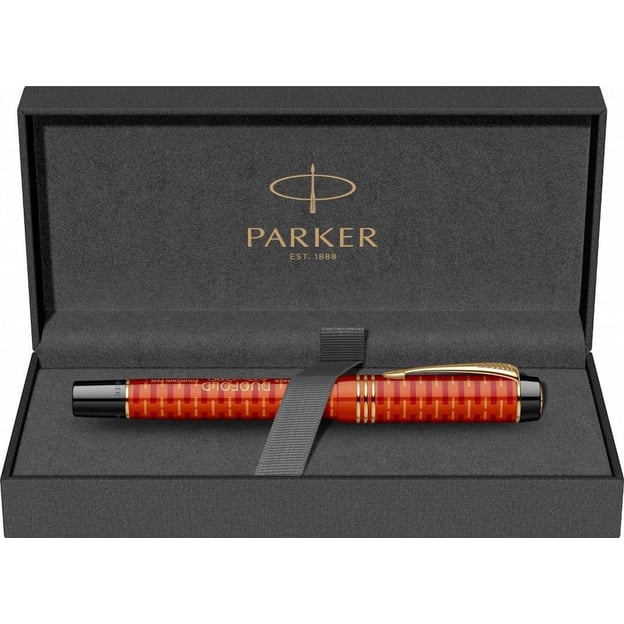 Parker DUOFOLD 100 Limited Edition Red FP18 F – перьевая ручка в ярко-рыжем цвете с тонким 18-каратным золотым пером. Выпущенная в ограниченном количестве в честь 100-летия модели Duofold, она продолжает традиции высокого качества, характерного для бренда Parker с 1921 года. Корпус и колпачок ручки выполнены из акриловой смолы, которая благодаря особой технологии сочетает несколько слоев материала, образуя эффектные полосы. На торце колпачка — золотая вставка с юбилейной гравировкой. Перо из 18-каратного золота с родиевым покрытием украшено уникальной гравировкой, посвященной этому важному событию. Для заправки можно использовать картриджи или конвертер для чернил из баночки (чернила продаются отдельно).