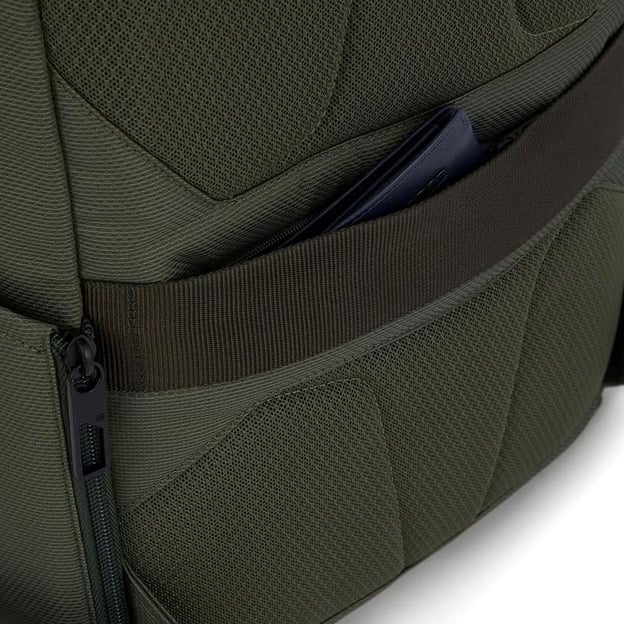 Для техники предусмотрено отдельное размещение ноутбука до 14″ — это помогает держать устройство в своем месте и не смешивать его с остальными предметами. Встроенная RFID‑защита добавляет практичности в городе и в поездках, снижая риск считывания данных с бесконтактных карт.