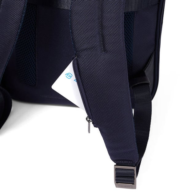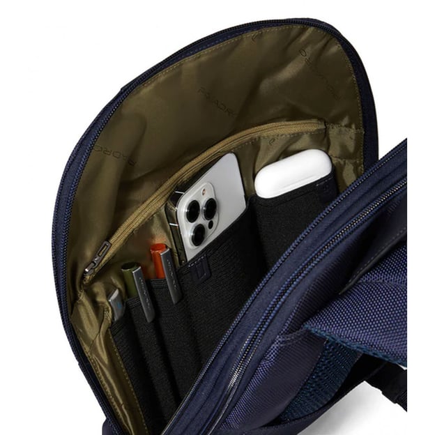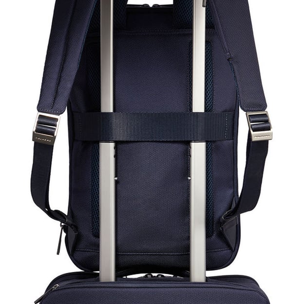 В основном отделении предусмотрено: мягкий отсек с клапаном и липучкой для ноутбука 15,6 дюймов, дополнительное мягкое отделение для планшета, карман на молнии, эластичное отделение для наушников, карман для смартфона и три эластичных держателя для ручек или карандашей. Сзади имеется ремень для крепления рюкзака на телескопическую ручку чемодана и скрытый карман на молнии. На левом плечевом ремне предусмотрен небольшой карман на молнии для мелочей.