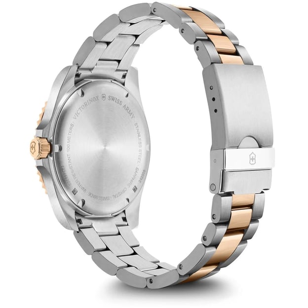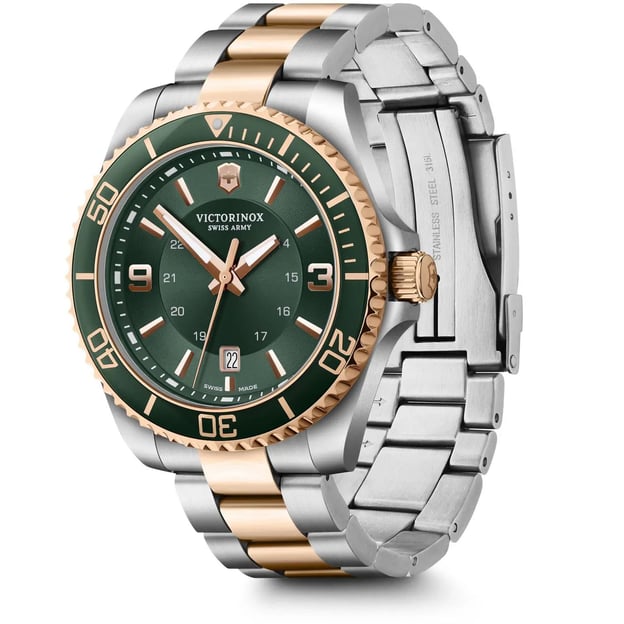 Victorinox V242008 - швейцарские кварцевые часы MAVERICK Large 43 мм с зеленым циферблатом и двухцветным стальным браслетом. Интересное сочетание цветов для мужчин, выбирающих нескучную элегантность. Швейцарский механизм, ставший воплощением надежности и точности. Досточно крупный корпус из высококачественной стали, функция даты, светонакопительная индикация Super-LumiNova®, мужественный браслет и множество деталей, которые отсылают нас к стилю дайверских часов: от однонаправленно вращающегося безеля до застежки с двойной блокировкой. А большой срок гарантии говорит об уверенности бренда в высоком качестве своих часов.