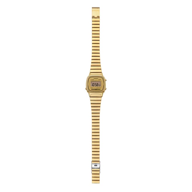 Casio STANDARD Digital LA670WEGA-9EF — компактные женские электронные часы в золотистом исполнении. Квадратный полимерный корпус и браслет из нержавеющей стали выглядят аккуратно и легко сочетаются с повседневной одеждой. Акриловое стекло защищает дисплей от царапин, а водозащита 3 ATM рассчитана на обычные бытовые ситуации при контакте с водой.
