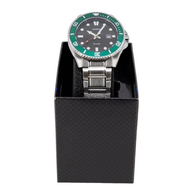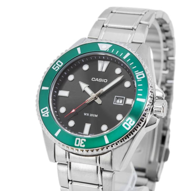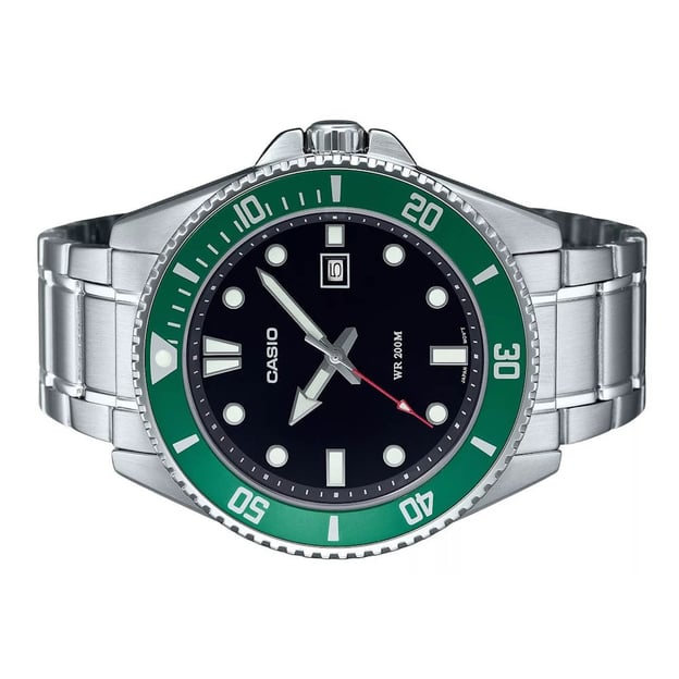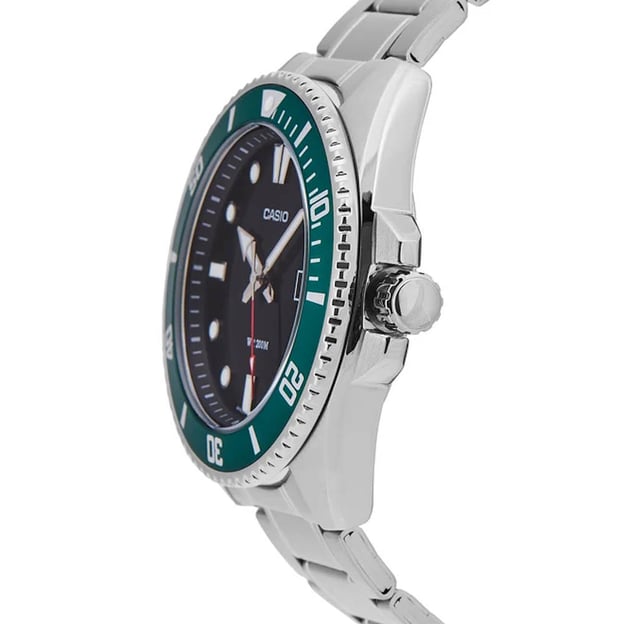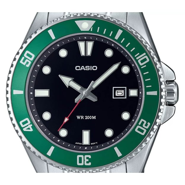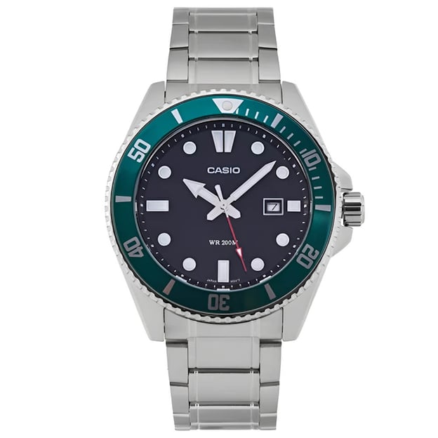 Casio STANDARD Analogue MDV-107D-3AVEF — мужские часы с усиленной водозащитой 20 ATM (200 м), рассчитанные на активное использование в воде. На черном циферблате есть окошко даты, а стрелки и метки с люминесцентным покрытием помогают быстро считывать время при слабом освещении.