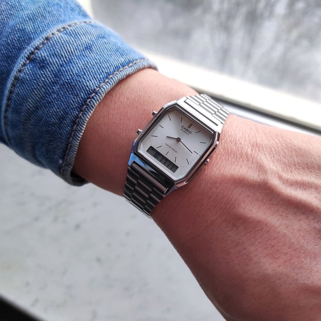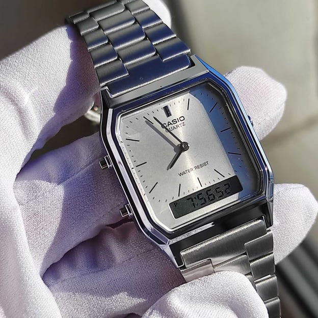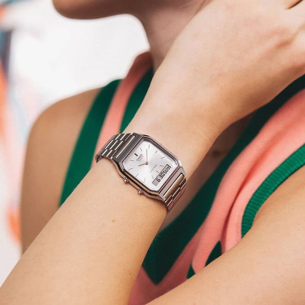 Часы из серии CASIO AQ 230 – это аккуратный прямоугольный корпус с двойным видом индикации: с привычными стрелками и цифровым многозадачным дисплеем.