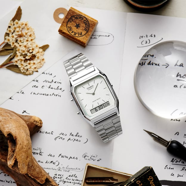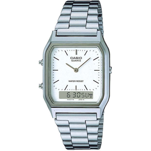 Часы из серии CASIO AQ 230 – это аккуратный прямоугольный корпус с двойным видом индикации: с привычными стрелками и цифровым многозадачным дисплеем.