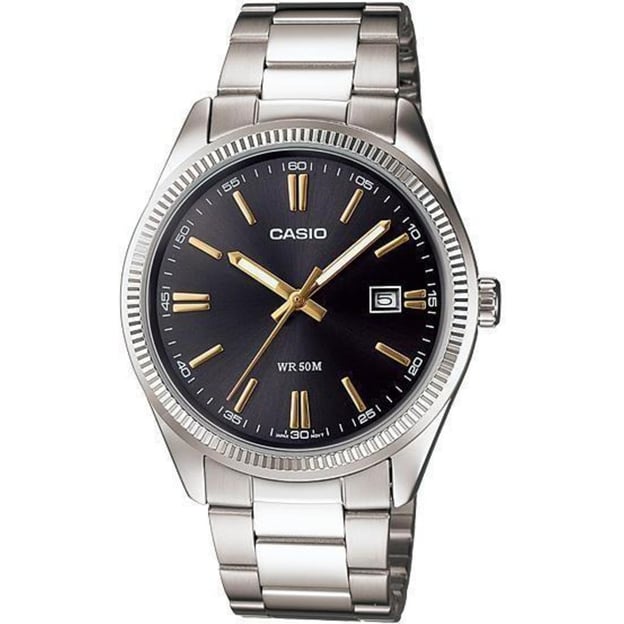 Серия Casio MTP 1302, несмотря на то, что заявлена как мужская, благодаря среднему размеру корпуса 38 мм и классическому стилю превосходно будет выглядеть и на женской руке. Нескучный дизайн с рифленым фиксированным безелем на корпусе, хорошо читаемый трехстрелочный циферблат, дополненный минутной шкалой и датой. Благородный контраст с черным циферблатом создают индексы и стрелки золотого цвета. Идеальные часы на каждый день.