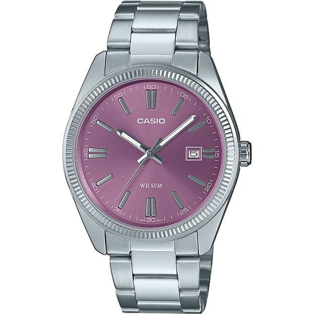 Мужские аналоговые часы Casio MTP-1302PD-6AVEF с браслетом из нержавеющей стали и фиолетовым циферблатом. Эффектная кварцевая модель, которая помимо времени, показывает также дату.